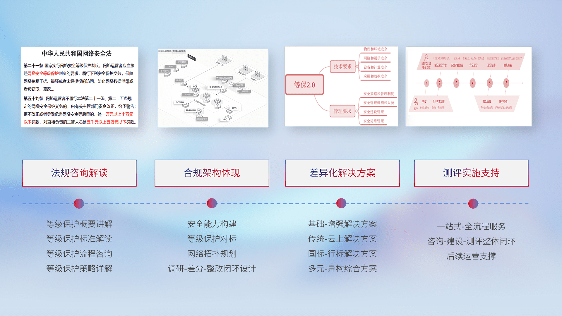 通过专业的法律咨询解读、、、、合规架构体现、、差异化解决方案、、、测试实施支持等服务,,,为客户量身打造等保合规体系。。